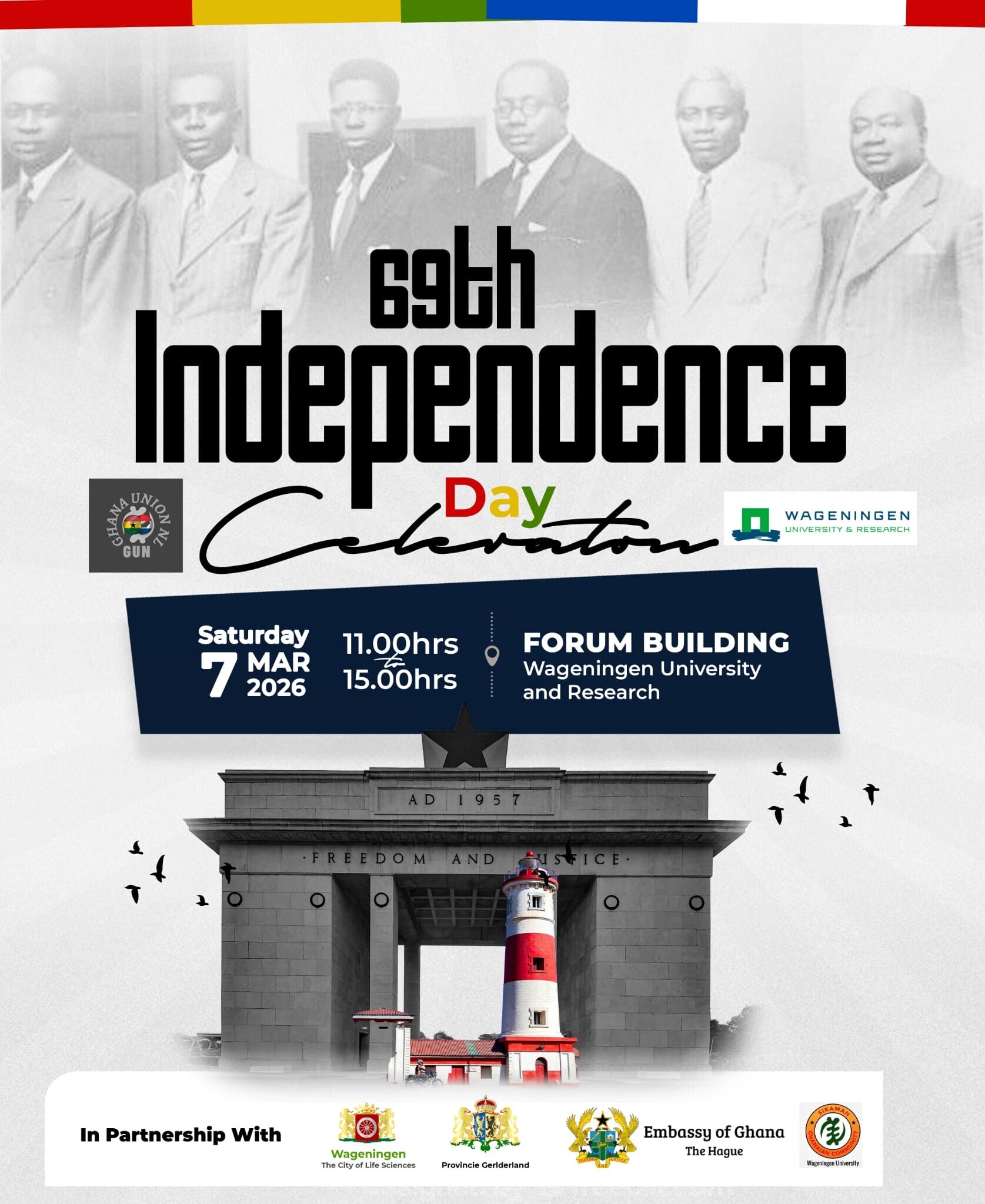 The National Executive of Ghana Union Netherlands, Ghana Union Gelderland, Sikaman and Wageningen University invite all persons of Ghanaian descent to come join in celebration of Ghana's 69th independence in Wageningen University.